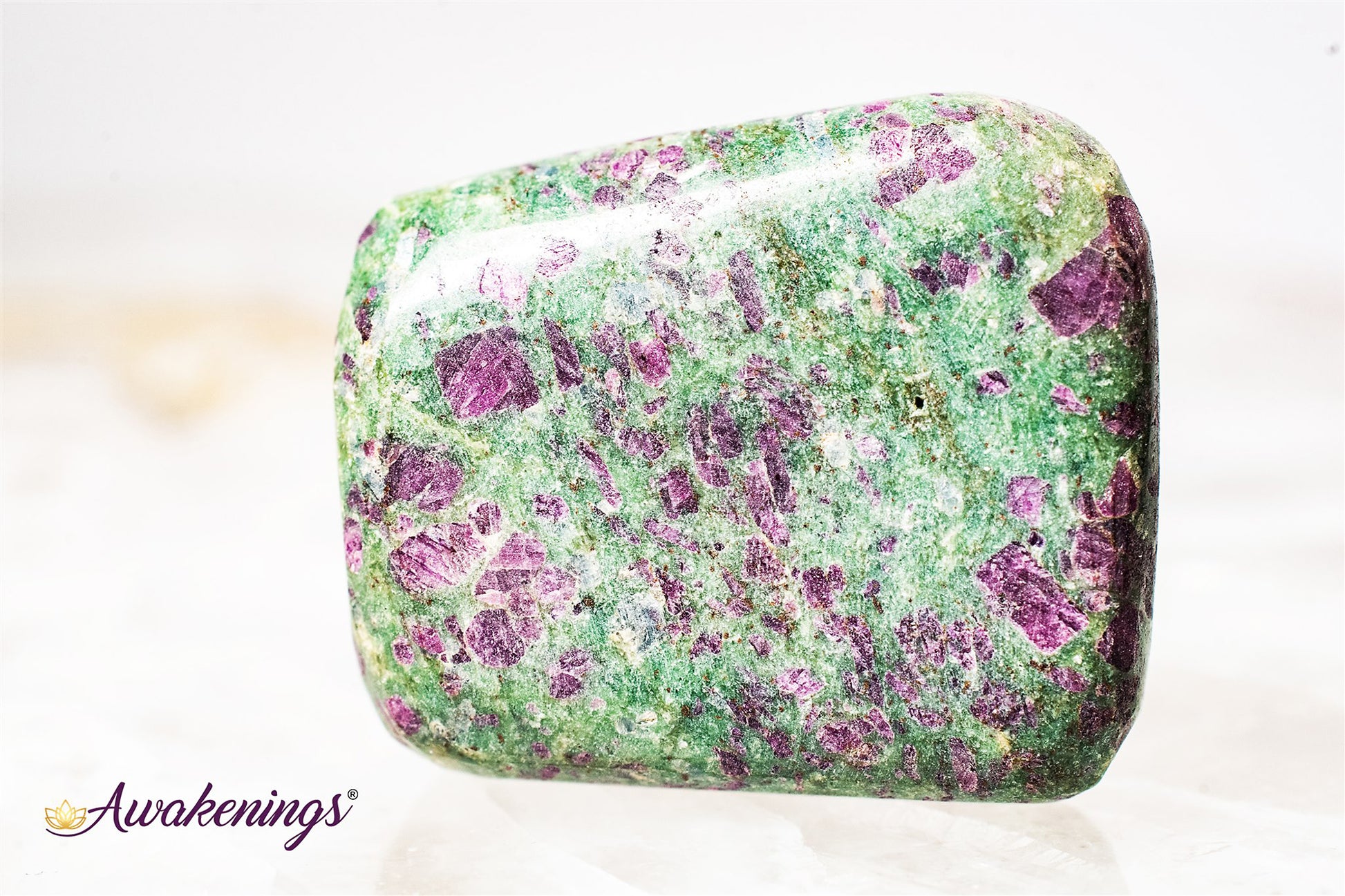 Ruby in Fuchsite is associated with the Root, Heart and Third Eye chakras.