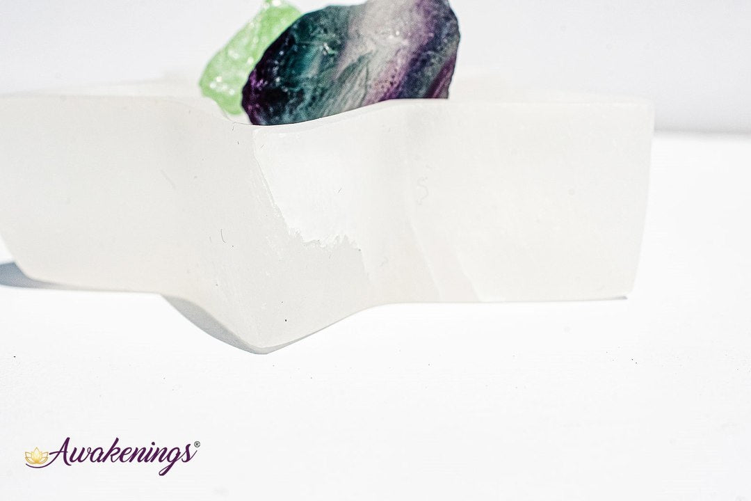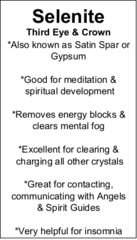 Selenite (also known as Satin Spar or Gypsum) is associated with the Third Eye & Crown chakras. Benefits of this stone include: