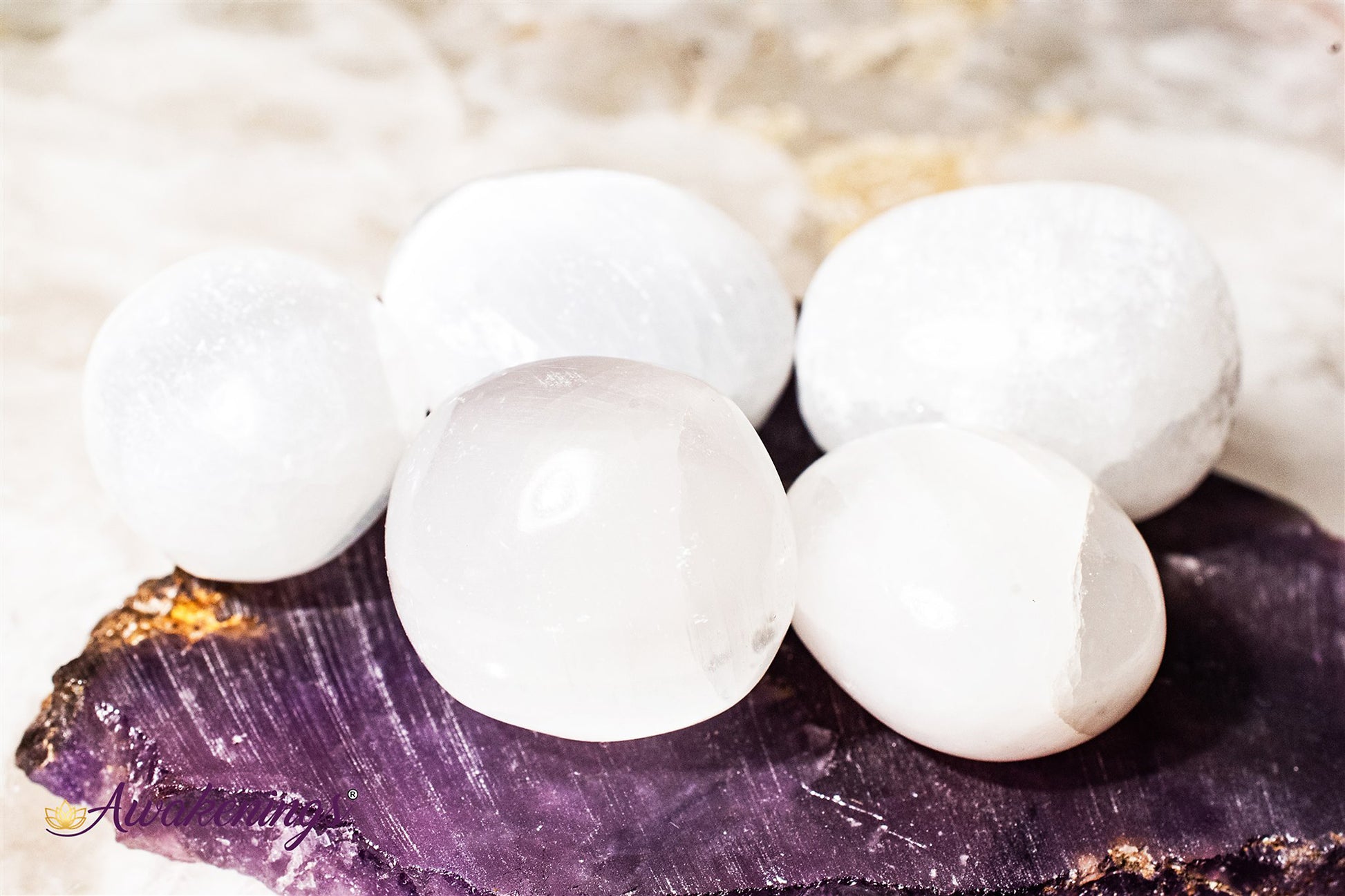 Selenite (also known as Satin Spar or Gypsum) is associated with the Third Eye & Crown chakras.