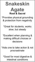 Each ethically sourced tumbled Snakeskin Agate comes with an informational card that explains its origin, unique properties, and tips for incorporating its energy into your life or energy practices.