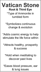 Each piece of ethically sourced, hand-tumbled Vatican Stone is carefully selected for its natural beauty, texture, and energy. Your stone arrives with an informational card describing its origins, benefits, and suggested uses—making it a meaningful addition to your personal collection or a thoughtful, spiritually inspired gift.
