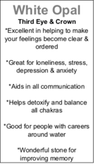 Spiritually, White Opal stimulates the crown and third eye chakras, deepening your connection to higher consciousness and enhancing intuitive insight. Mentally, it promotes clarity, focus, and emotional equilibrium, helping to release negativity, foster self-awareness, and encourage thoughtful decision-making. Physically, White Opal’s calming energy is believed to support overall well-being, reduce stress, and harmonize energy flow, creating a sense of balance and renewal.